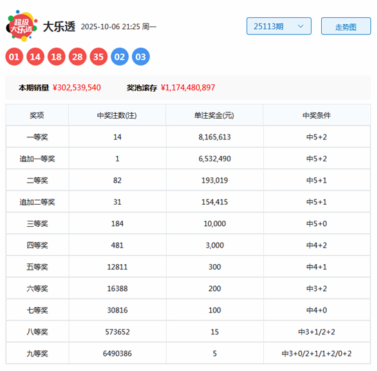 大乐透第2025113期开出奖号为01、14、18、28、35+02 03。其中前区奇偶比为2:3,三区比为1:2:2,大小比为3:2,后区为全小组合。