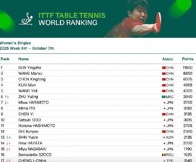 女片面,中国队球员孙颖莎、王曼昱、陈幸同、蒯曼、王艺迪位列前五,陈熠位列第九。WTT中国大满贯女单四强申裕斌排名高涨4个排行位列第13;八强朱雨玲排名高涨1个排行位列第6;八强朱芊曦排名高涨11个排行位列第24;十六强李昱谆排名高涨21个排行位列第47,刷新个东谈主职业生计排名新高;三十二强汉娜·高达排名高涨2个排行位列第23,刷新个东谈主职业生计排名新高;三十二强叶伊恬排名高涨11个排行位列第48,刷新个东谈主职业生计排名新高;三十二强安娜·赫尔希排名高涨22个排行位列第54,刷新个东谈主职业生计排名新高;三十二强朱念念冰排名高涨32个排行位列第68,刷新个东谈主职业生计排名新高。