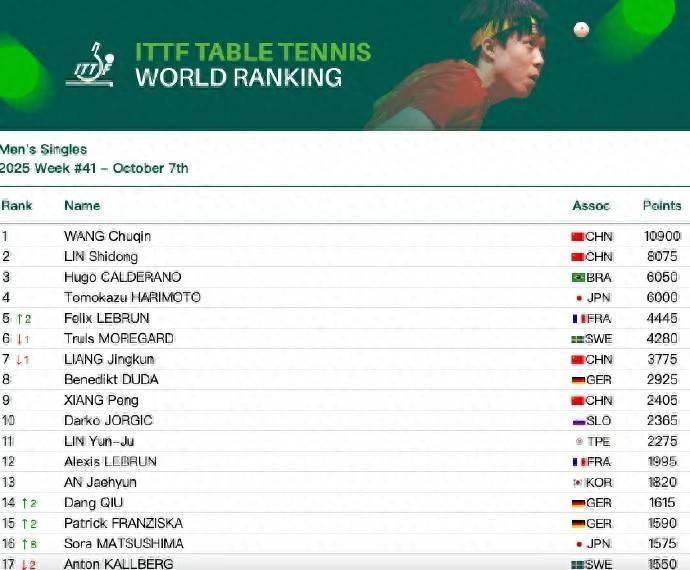林诗栋以8075分位列第2,雨果6050分排名第3,梁靖崑位列第7,向鹏位列第9。WTT中国大满贯男单亚军费利克斯·勒布伦排名高涨2个排行位列第5。八强宇田幸矢排名高涨7个排行位列第26;八强陈俊菘排名高涨67个排行位列第46,刷新个东谈主职业生计排名新高;十六强弗拉芬·科顿排名高涨9个排行位列第43,刷新个东谈主职业生计排名新高;十六强爱德华·约内斯库排名高涨24个排行位列第50,刷新个东谈主职业生计排名新高;十六强滨田一辉排名高涨27个排行位列第51,刷新个东谈主职业生计排名新高。